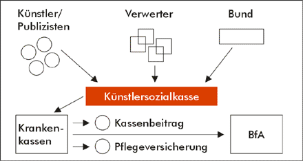 - Zum anderen zieht die KSK den Beitragsanteil der Versicherten, die Künstlersozialabgabe der abgabepflichtigen Unternehmen sowie den Bundeszuschuss ein.